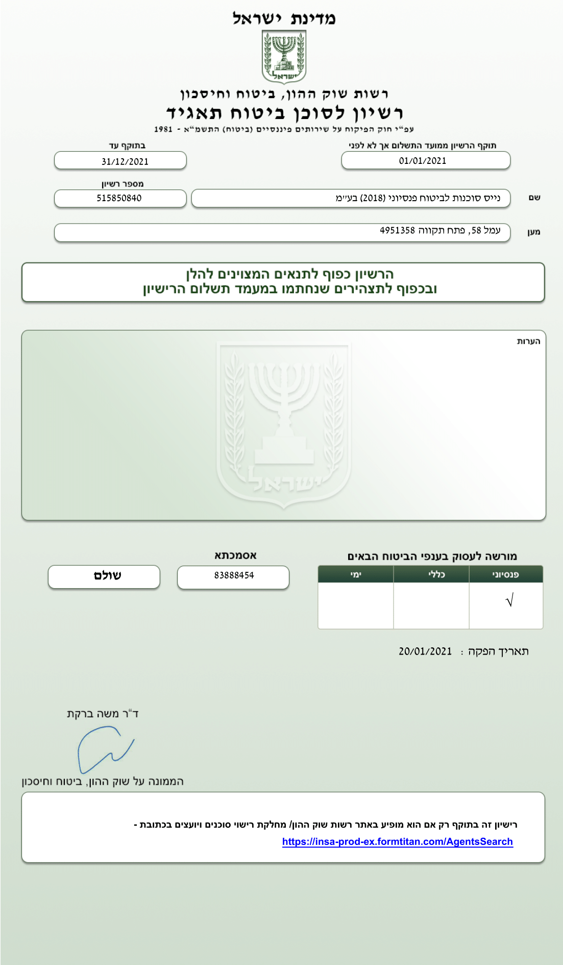 כמו כן סוכנות הביטוח בעלת ניסיון רב בכל סוגי הביטוחים והשירותים הפיננסים כמו ביטוחי בריאות, ביטוחי חיים , אלמנטרי, פנסיה ביטוחי מנהלים , קופות גמל וקרנות השתלמות שילוב וחיבור הוליסטי תוך כדי יצירת תיק ביטוח מוקפד ומדויק לצרכי הלקוח.